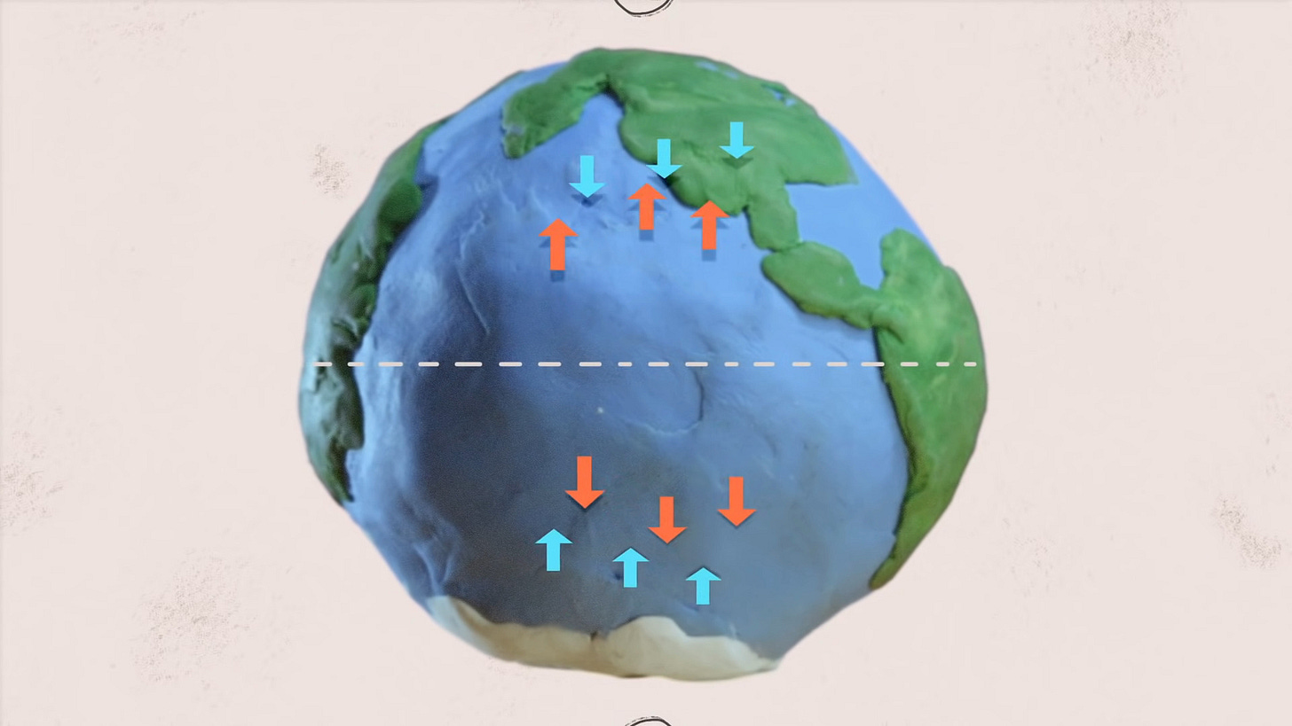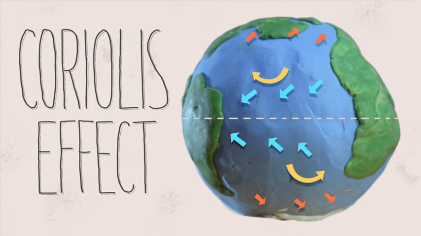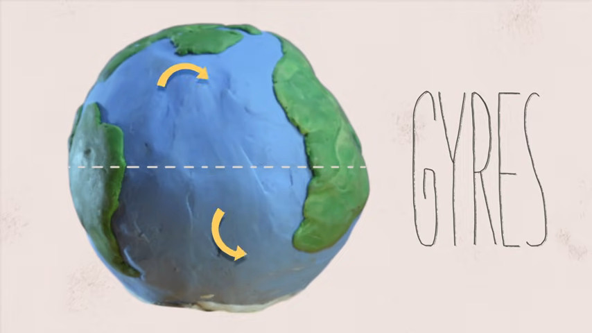 Στη γη δημιουργούνται στην επιφάνεια της θάλασσας οι λεγόμενες Gyres (ελληνική προέλευση λέξεως-κυκλικές κινήσεις): Στο βόρειο ημισφάριο ειναι δεξιόστροφα και στο νότιο ημισφαίριο αριστερόστροφα και αυτό επειδή η γη περιστρέφεται και μεταφέρει την ένταση της περιστορφής στους ανέμους.