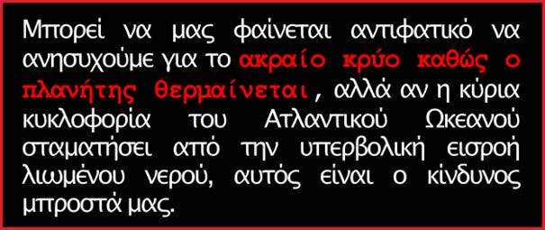 Μπορεί να φαίνεται αντιφατικό να ανησυχείτε για το ακραίο κρύο καθώς ο πλανήτης θερμαίνεται, αλλά αν η κύρια κυκλοφορία του Ατλαντικού Ωκεανού σταματήσει από την υπερβολική εισροή λιωμένου νερού, αυτός είναι ο κίνδυνος μπροστά.